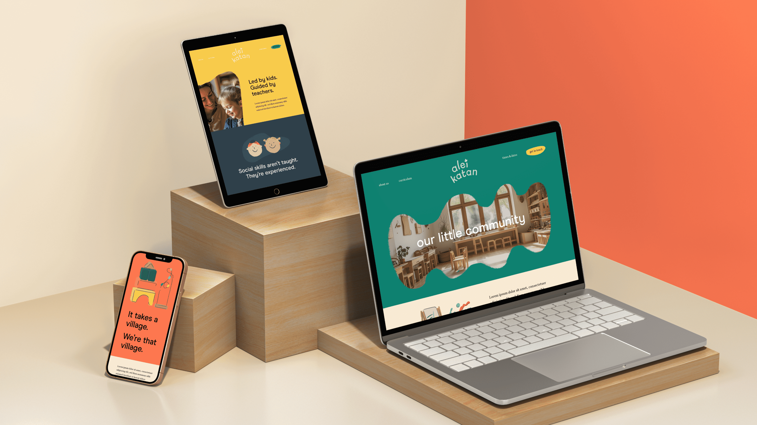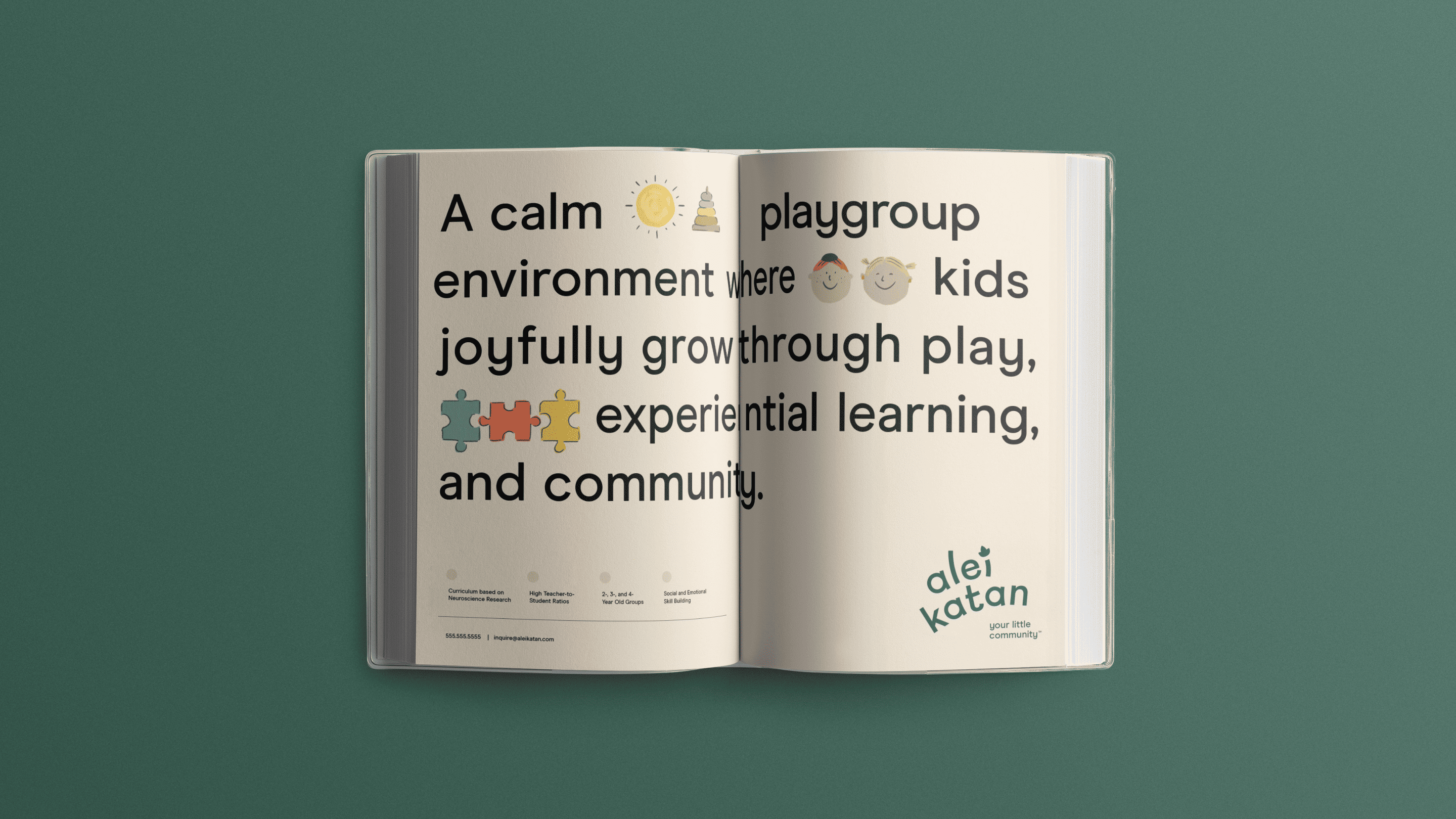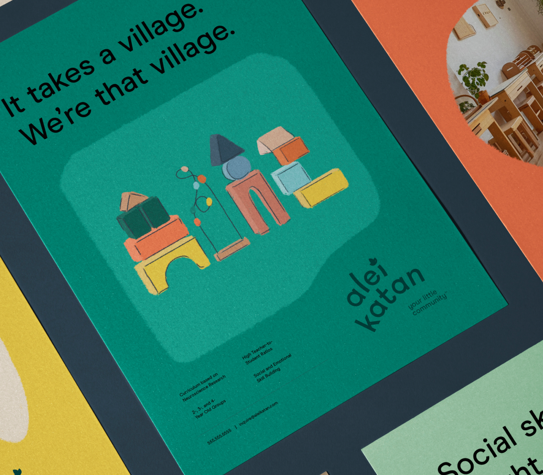 Early childhood is more than just learning letters. Alei Katan is all about the power of community and connecting with peers, so we put it right in their tagline: Your little community. Throughout the visual identity, beautiful touches of warmth, from the vibrant colors to the custom hand-drawn illustrations, bring that coziness to life.