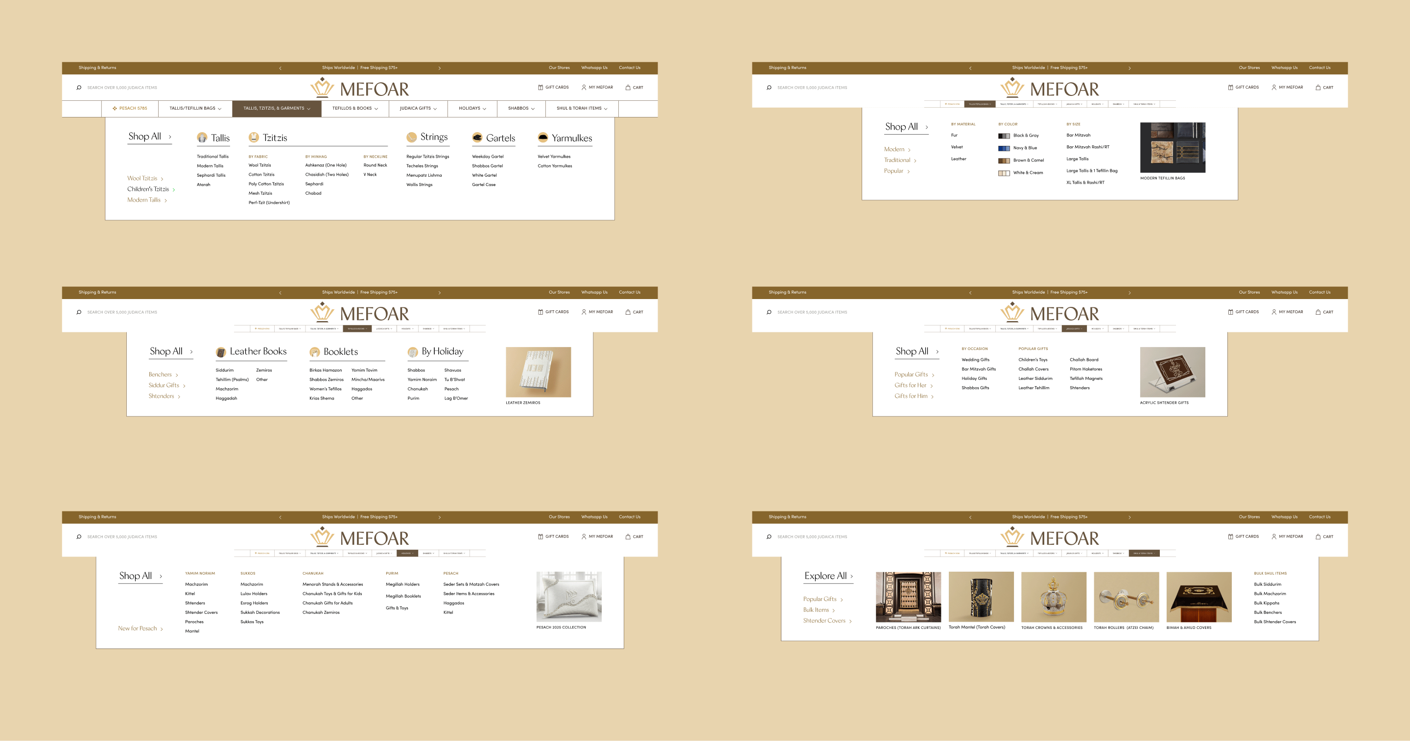 Merchandising was central to the strategy. Website visitors knew some of what Mefoar carries, but not the full breadth of their catalog. We designed a smorgasbord-style homepage that visually showcases the range of products through rich photography and clear pathways into each category. A comprehensive, thumbnail-based navigation system makes it easy to understand what’s available at a glance, removing friction that text-heavy menus often create.